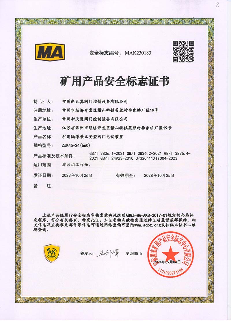 礦用隔爆ZB10-24中國國家強制性產品認證證書110.2